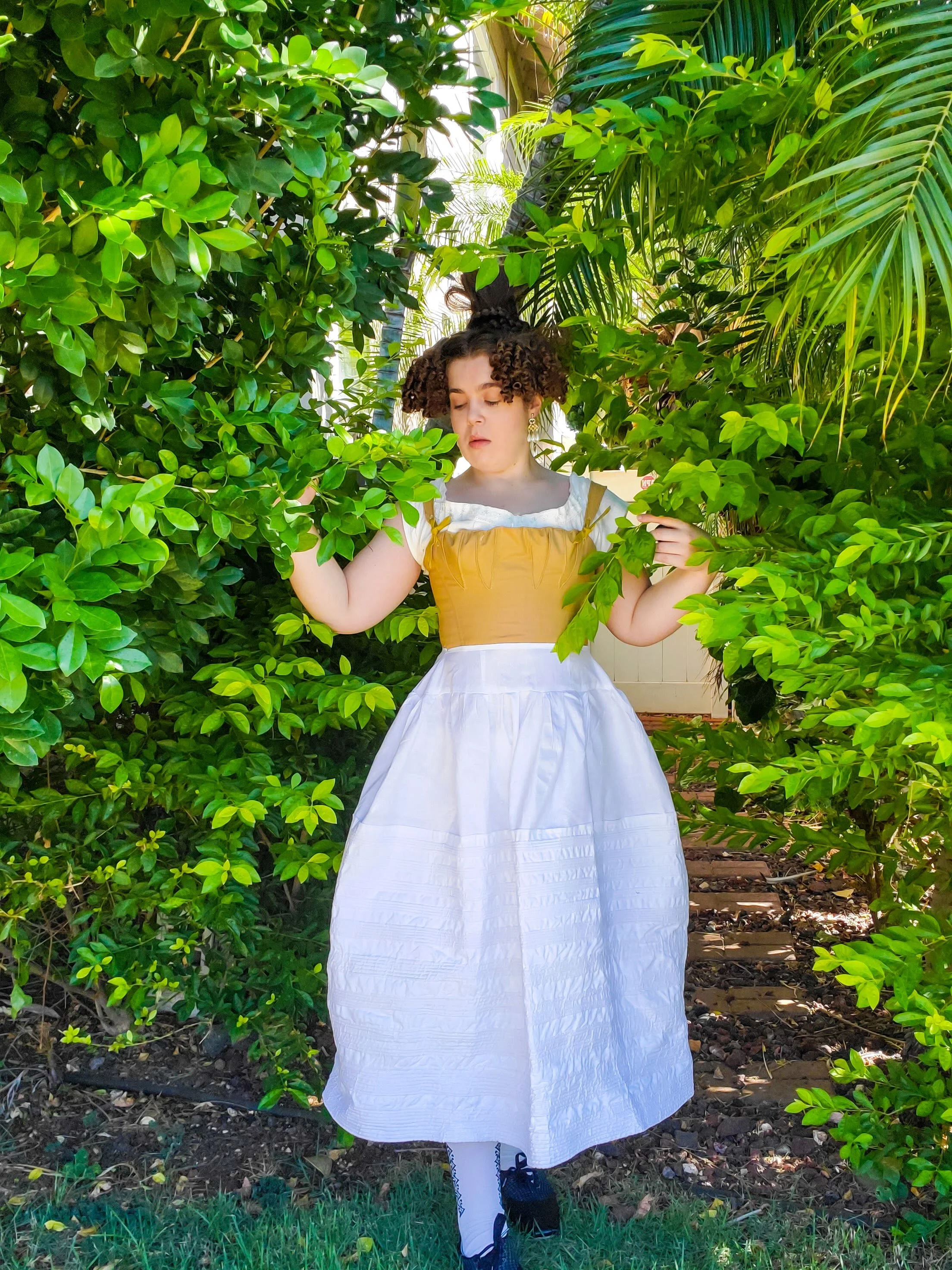 The second garament that needed to be made was the corset, which I was going to feature on my YouTube channel, but I ended up sewing it so fast I didn’t have time to pick up my camera. The pattern is Redthreaded’s 1830s Corset (9) and the fashion fabric is a kona cotton in the color “honey” (10) the strength fabric is a cotton coutil (11). The busk is an exculsive from Redthreaded (120, the boning is 7mm syntheic whalebone (13), the waist tape is a petersham ribbon (14), and the lacing cord a simple cotton white one (15).